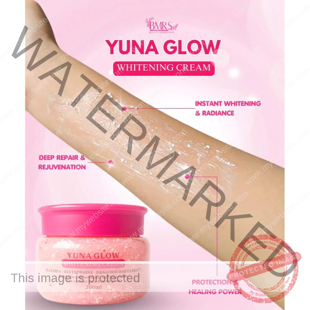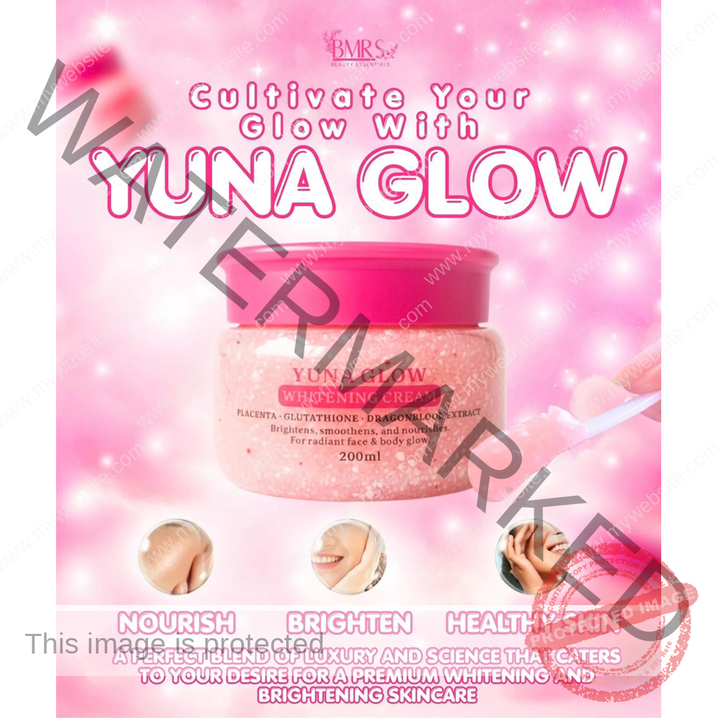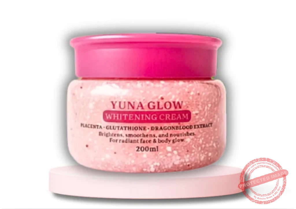 Yuna Glow Whitening Cream combining Placenta Glutathione and Dragon Blood Extract for skin whitening, anti-aging, and rejuvenation for that powerful, lasting glow.