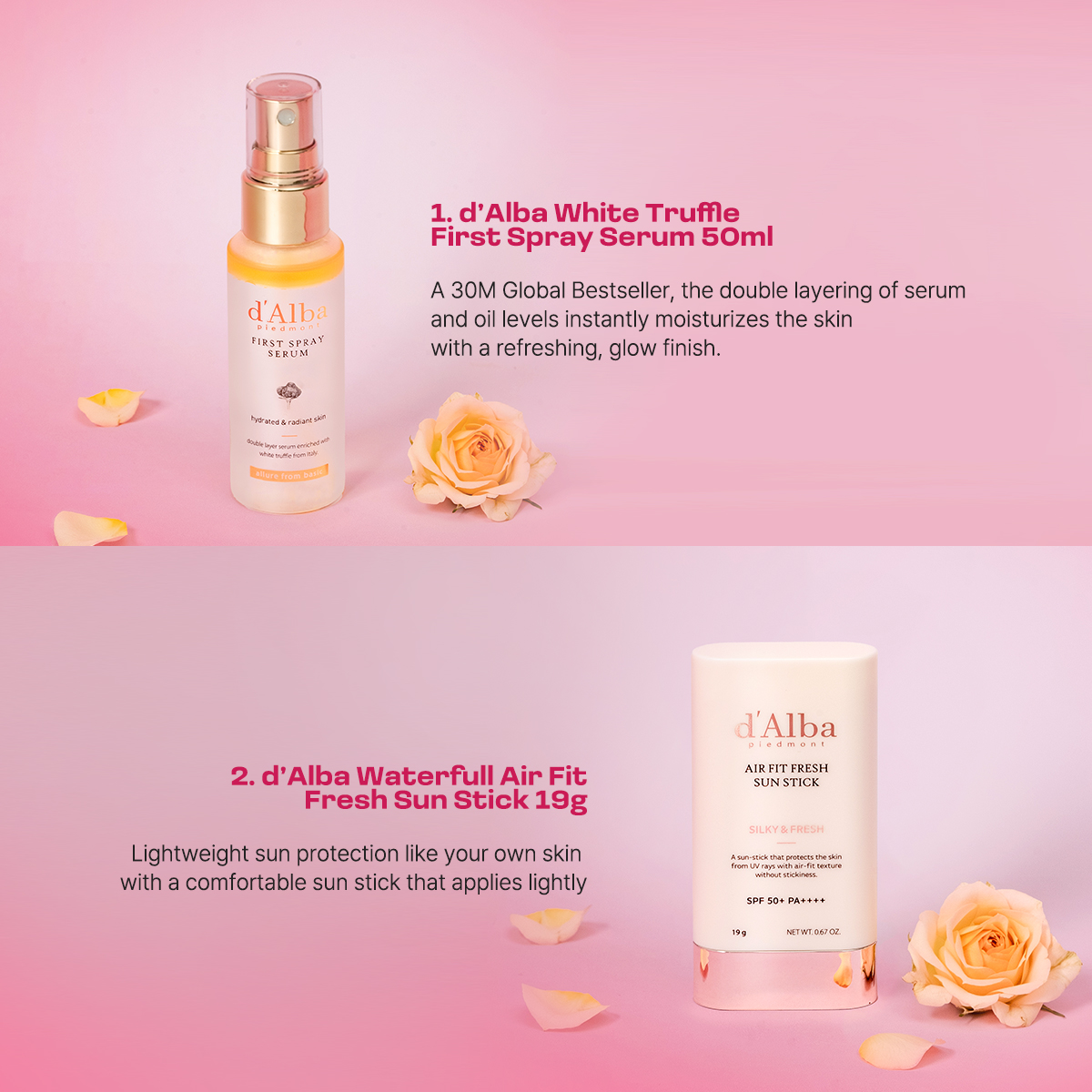 d’Alba Cherry Blossom Gift Set (First Spray Serum 50ml, Sun Stick 19g, Hair Perfume Serum 50ml, Wood Brush)