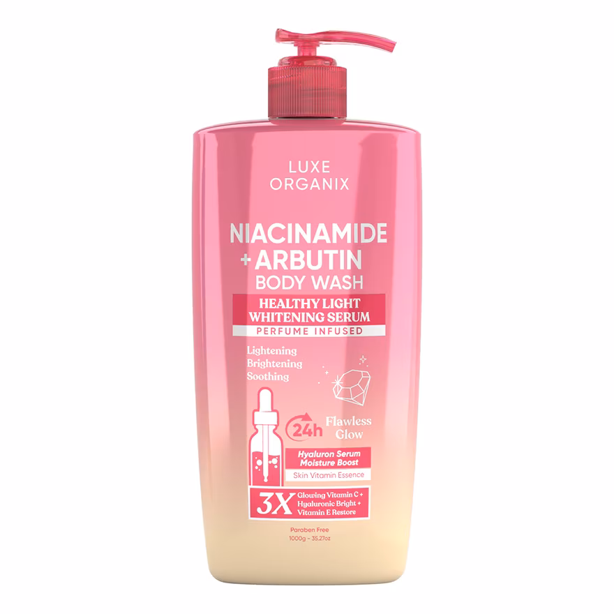 Niacinamide has brightening and skin-soothing properties that helps even out skin tone and minimize pore appearance. This ingredient delivers a flawless and sleek-looking complexion while also providing added hydration to avoid dry and flaky skin. Arbutin is a natural skin brightener that aids on diminishing dark spots and pigmentation. It is a gentle and skin-friendly ingredient that also enhances the overall luminous glow of the skin. The dynamic duo of Vitamins C and E, as antioxidants, protects skin against premature skin aging and provides UV protection, keeping your skin fresh, vibrant, and youthful. Discover the secret to flawless, glowing skin with Luxe Organix Niacinamide + Arbutin Body Wash Healthy Light Whitening Serum. This serum-body wash is enriched with Niacinamide and Arbutin that help brighten and improve the appearance of skin for a smooth and velvety shine, providing 24 hours of flawless glow. Also formulated with Vitamin C, Hyaluronic acid, and Vitamin E that brightens, soothes and revitalizes dull-looking skin. Embrace this serum-body wash as it pampers your skin, leaving it smooth, refreshed, and beautifully glow