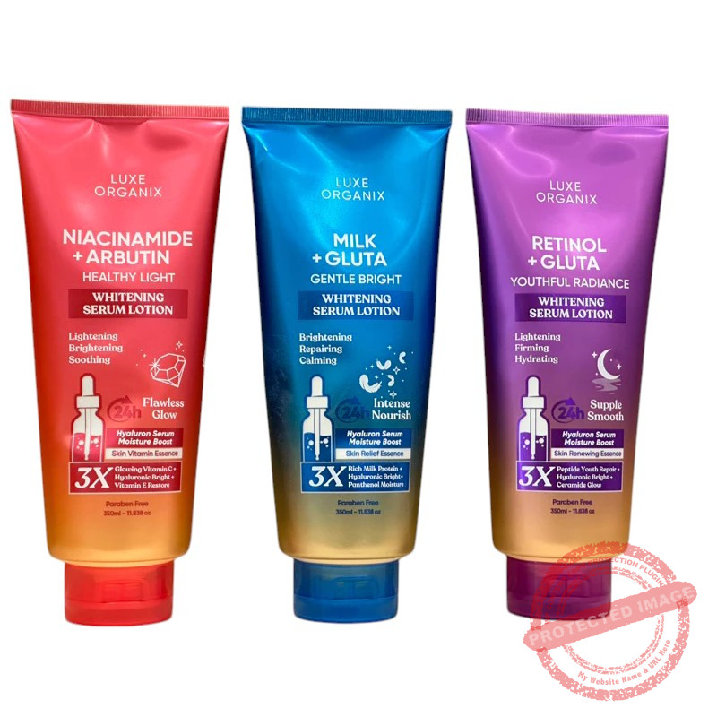 LUXE ORGANIX Milk + Gluta Whitening Serum Lotion 350ml Luxe Organix Milk + Gluta Gentle Bright Whitening Serum Lotion features a lightweight, non-sticky, and moisturizing formula that gently brightens the skin to restore a naturally radiant complexion. Enriched with Milk Protein and Glutathione to intensely nourish while lightening the skin to reveal a more even skin tone. With added benefits from Hyaluronic Acid, Aloe Vera, Centella Asiatica, and Panthenol, this lotion is richly formulated with gentle actives to soothe and repair dry, irritated skin. Indulge your skin with this concentrated serum-lotion hybrid that helps provide long lasting moisture by penetrating deeply into the skin, leaving you with brighter, softer and smoother skin.