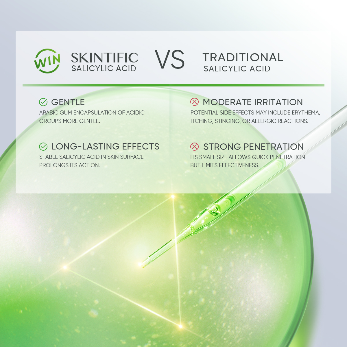 Salicylic Acid: Unclog and Clearing pores, Reduce sebum and effective calming acne