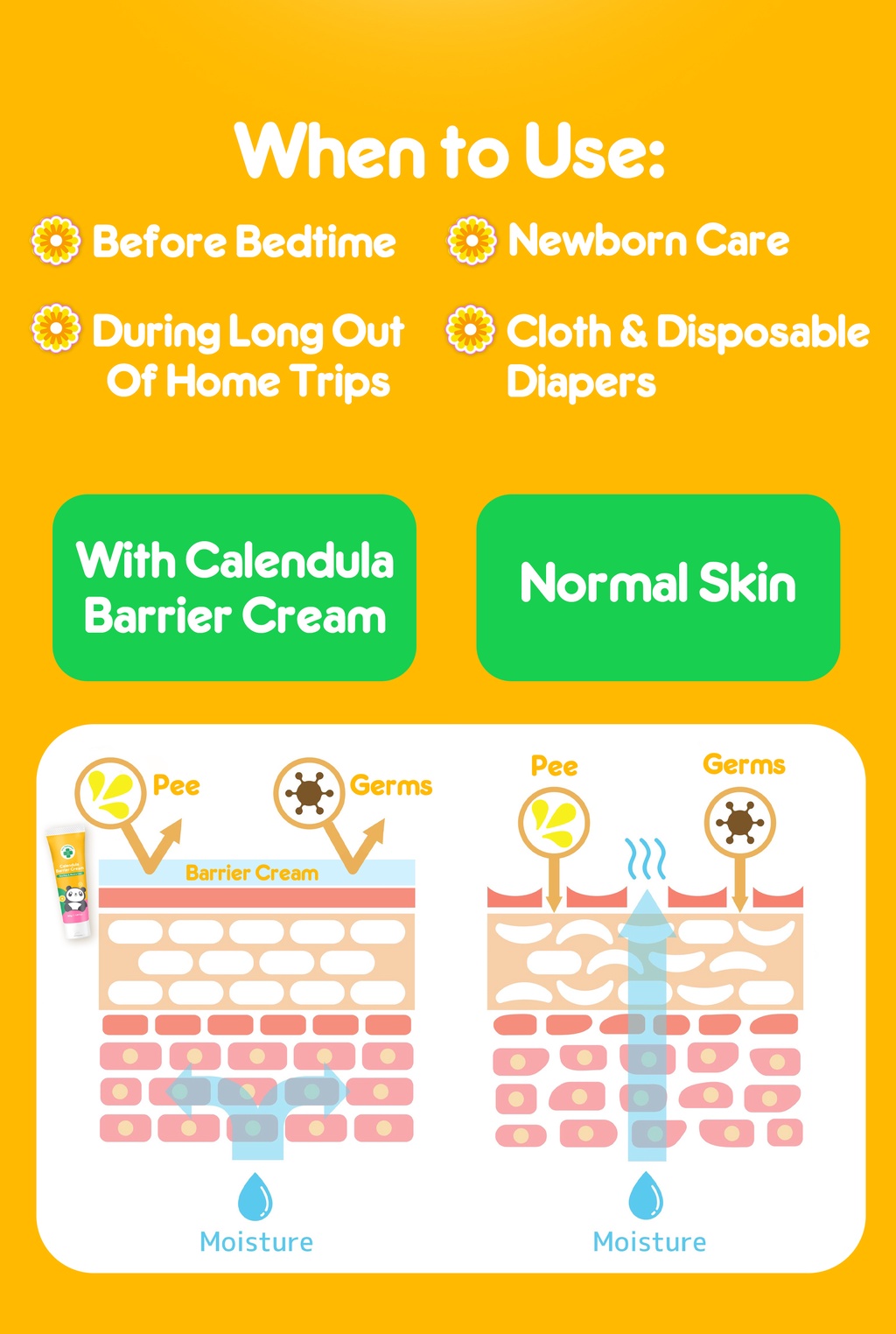 The Calendula Barrier Cream is a long-wear formula specially made with Calendula to gently care for baby’s bottom.