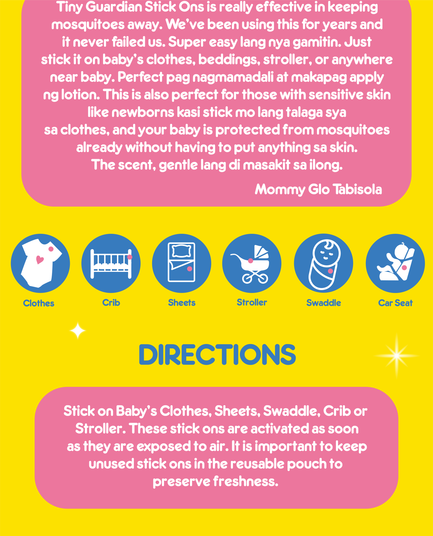Tiny Buds Tiny Guardian Stick Ons are a convenient way to have the long lasting scent of Citronella for your little one. These stick ons are lovingly made to have a gentle scent that can last up to 6 Hours!